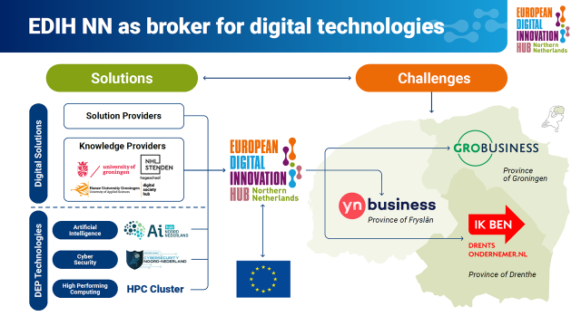 - Een Ondernemersloket waar bedrijven terecht kunnen met vragen over digitalisering. Dit loket wordt uitgevoerd door eerstelijnsorganisaties Ynbusiness (Friesland), GroBusiness (Groningen) en Ik Ben Drents Ondernemer (Drenthe). Ook de aanbodkant is inmiddels georganiseerd. Fundamentele vragen worden ingebracht bij de kennisinstellingen, actiegerichte vragen gaan naar Solution Providers en meer toepassingsgerichte vraagstukken naar studenten van de Digitale Innovatie Werkplaatsen (HBO) en de Werkplaatsen Digitaal Vakmanschap (MBO). Voor specifieke ondersteuning op het gebied van de door de EU belangrijk geachte DEP-Technologies (Cyber Security, Kunstmatige Intelligentie en High Performance Computing) zijn speciale voorzieningen