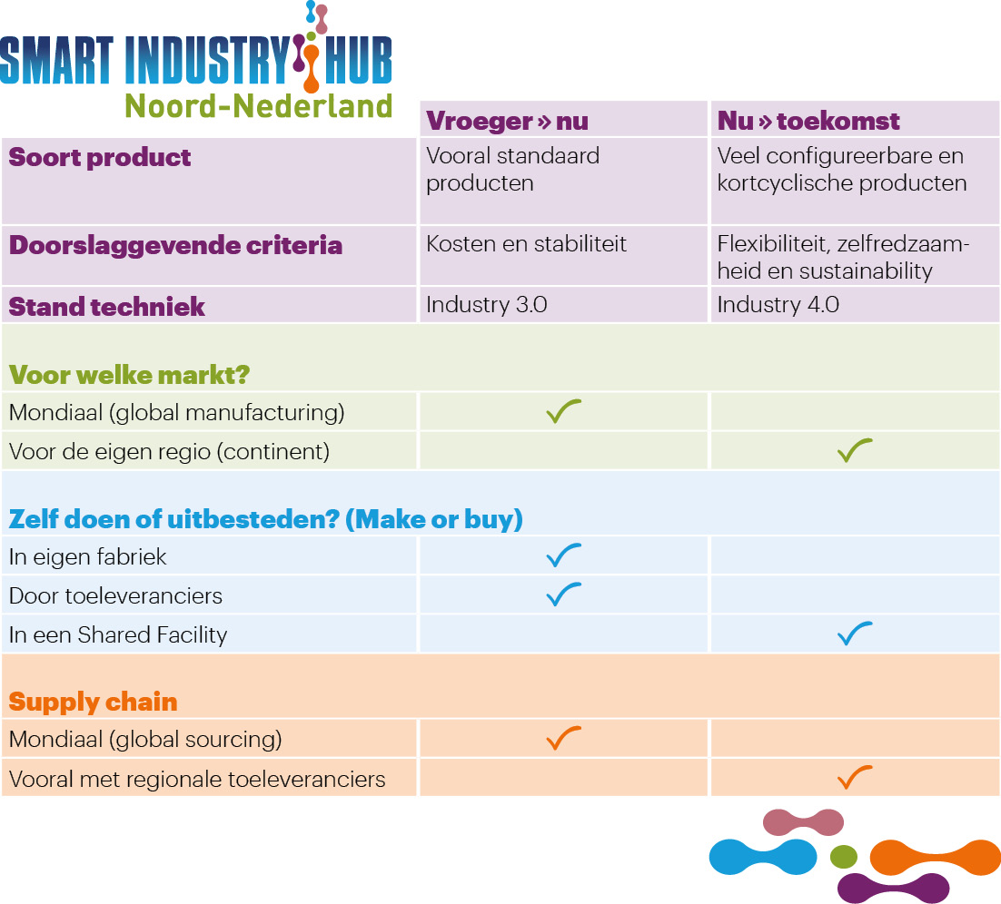 De eerste is global manufacturing. Vroeger, in de tijd van de standaardproducten (‘One size fits all’) kon je prima vanuit één plek, liefst de goedkoopste, een zo groot mogelijk gebied bereiken. Als het even kan de hele wereld. Alle ballen op kostprijsreductie! Dat werkt uitstekend in een voorspelbare wereld en als er weinig verandert. Vandaag de dag zien we echter steeds meer configureerbare producten (standaardproducten die klantspecifiek worden afgebouwd) of kort cyclische producten. Kwestie van meer welvaart en kieskeurige consumenten. Als je niet-standaardproducten maakt, kun je beter dicht op de markt zitten, en dan het liefst bij markten waar de trends gezet worden.